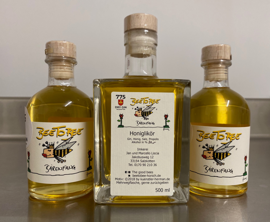 Wie im vergangenen Jahr haben wir in Zusammenarbeit mit der Stadt Salzkotten einen ganz besonderen, neuen Bärenfang kreiert. Der Sälzer Gin 775 überrascht mit einer spannend salzigen Note und ist eigens für das 775jährige Bestehen der Stadt kreiert worden. Und genau mit diesem Gin haben wir unseren Honiglikör hergestellt. Zum Gin kommt also selbstverständlich Honig aus eigener Ernte und zusätzlich - und das macht ihn doppelt einzigartig - Propolis aus eigener Ernte. Dieser Bärenfang schmeckt wie ein Kräuterlikör und besticht im Abgang durch die leicht salzige und angenehm honigsüße Note. Er wartet mit einem Alkoholgehalt von 30,5 % auf. Es gibt ihn in der für uns typischen Apothekerflasche zu 250 ml oder ganz neu in der kantig-eleganten Flasche zu 500 ml.