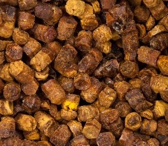 Angereichert wird der Pollen mit Drüsensekreten und Enzymen und wird anschließend mit einer dünnen Schicht Propolis verdeckelt, um ihn zu konservieren. Durch die Temperatur von ca. 35 Grad im Bienenstock setzt im Bienenbrot eine Fermentation ein, die es lange haltbar macht. Im Perga enthalten sind zahlreiche Vitamine wie B1, B2, B6, OPC, A, E, H und K. Darüber hinaus Flavonoide (sekundäre Pflanzenstoffe, die den Blüten und Früchten die Farbe geben), die für uns freie Radikale abwehren.