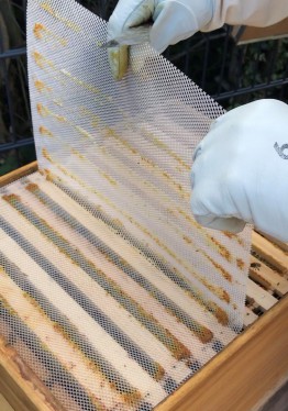 Für die Gewinnung der Propolislösung kratzt der Imker jedoch nicht das Propolis von den Innenwänden der Beute (Fachausdruck für die relativ moderne Behausung eines Bienenvolkes in der Imkerei), sondern man legt Propolisgitter auf die in der obersten Etage befindlichen Rähmchen (wie im Foto zu erkennen), deren Löcher dann von den Bienen mit Propolis "gestopft" werden. Von diesen Gittern kann man dann den Rohstoff für die Lösung gewinnen, die in hochprozentigem Alkohol angesetzt wird.