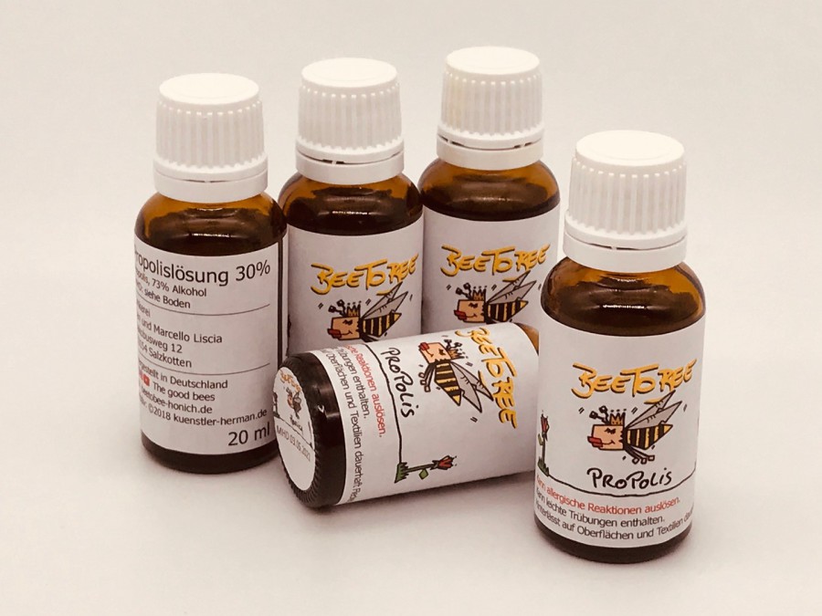 In der Natur- und Alternativmedizin ist Propolis seit jeher ein anerkanntes Produkt, das sowohl äußerlich als auch innerlich angewandt werden kann. Es lohnt sich zu googlen, ob Propolis nicht gerade auch für das eigene Zipperlein das richtige Mittelchen sein kann. Auch für die Weiterverarbeitung bei der Herstellung eigener Cremes ist es bestens geeignet. Wie bei allen Bienenprodukten sollte vor der Anwendung erst einmal ärztlich abgeklärt werden, ob eine Allergie gegen Bienenprodukte vorherrscht, um allergische Reaktionen zu vermeiden. Darüber hinaus sollte man mit Propolis vorsichtig umgehen, da es von den Bienen "für die Ewigkeit" produziert wird und auf Textilien und Oberflächen dauerhaft Verfärbungen hinterlassen kann. Propolislösung duftet ätherisch, pflanzlich und schmeckt aromatisch bis scharf.